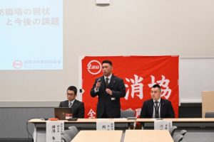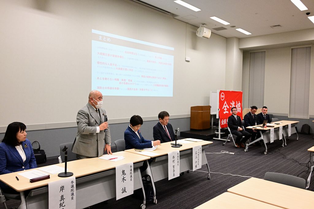 議員懇談会では、石上千博自治労本部中央執行委員長と岡大祐全消協会長の挨拶の後、樺澤隼人全消協副会長より交代勤務や仮眠時間等の労働時間、慢性的な人員不足、女性消防吏員の増員の取り組み、逼迫する救急の現状、他の公安職との賃金格差などの待遇改善の課題についての説明・要請がありました。その後の意見交換では、女性消防吏員が働きやすい職場環境・施設の整備の推進のためには国会議員だけでなく自治体議員との連携が必要であること、国民の生命・財産を守るためにも消防士の処遇改善が必要であることなどについて議論がありました。